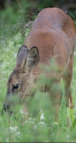 Pas moins de deux kilos sont cueillis en plus de 2000 bouchées chaque jour. C’est en moyenne 750 kg de nourriture ingérée par un adulte en une année. Herbivore ruminant comme le sont les bovins, il affectionne les lisières où il utilise le couvert dense des bordures baignées de lumière. Il s’y cache et y trouve une nourriture dense et riche en sucre comme les baies ou les graminées.